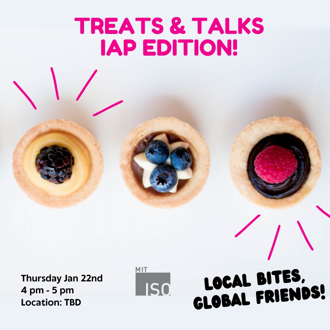During IAP, come relax with other international students and mingle over a sweet treat.Time: 4pm-5pmLocation: 56-167Organized and hosted by our ISO Grad Fellows team