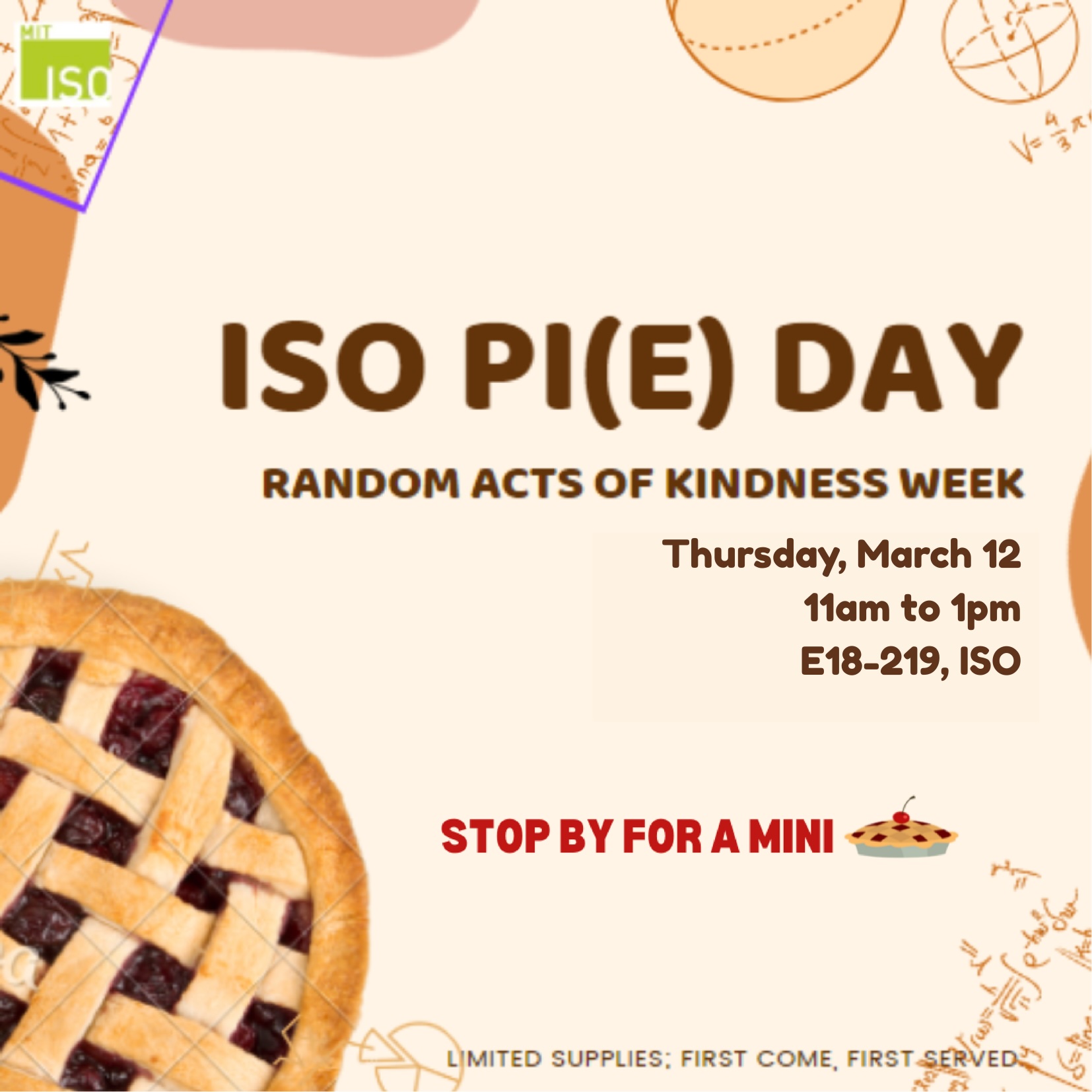 To celebrate Pi Day and for Random Acts of Kindness (RAK) Week: Stop by the ISO for a mini pie (while supplies last)!E18-219 Join us for ISO Pi(e) Day as […]